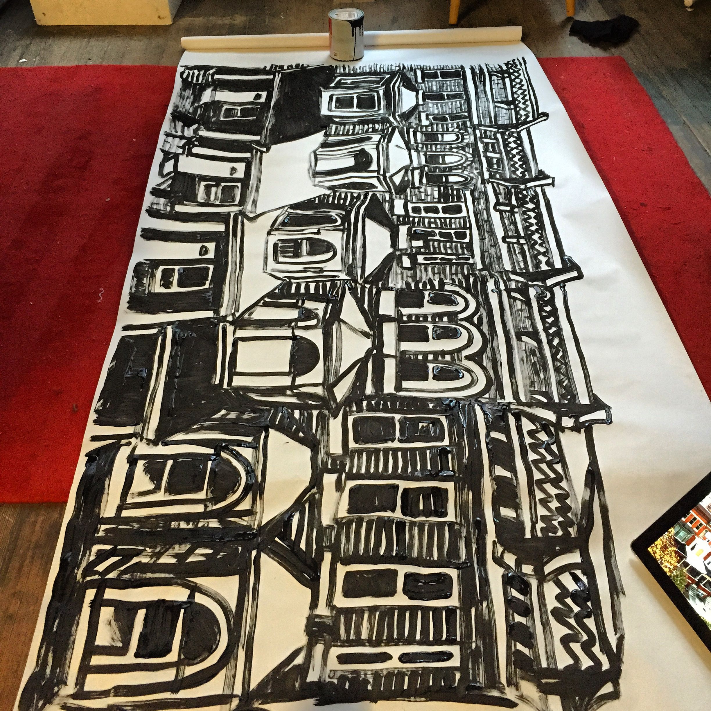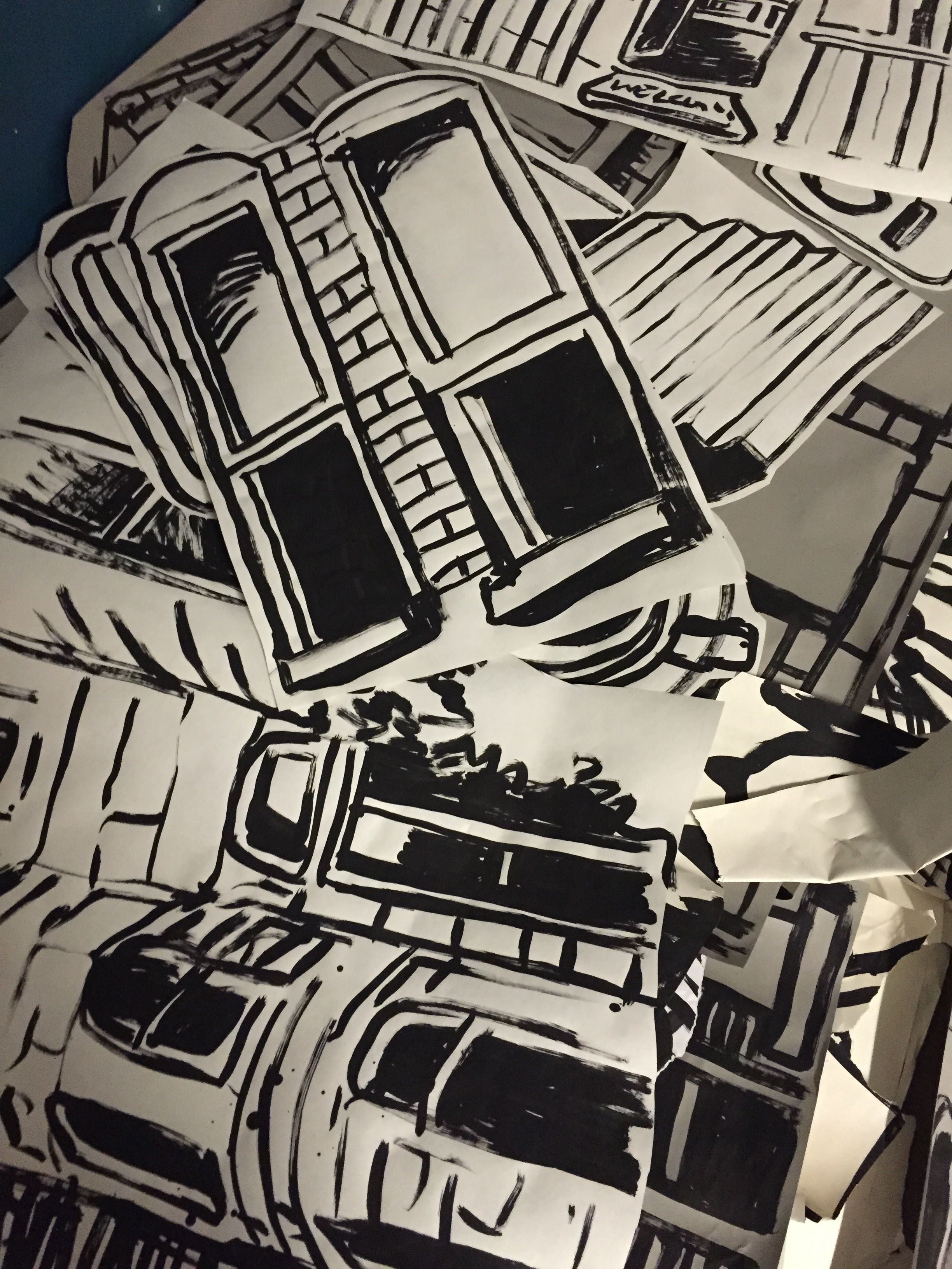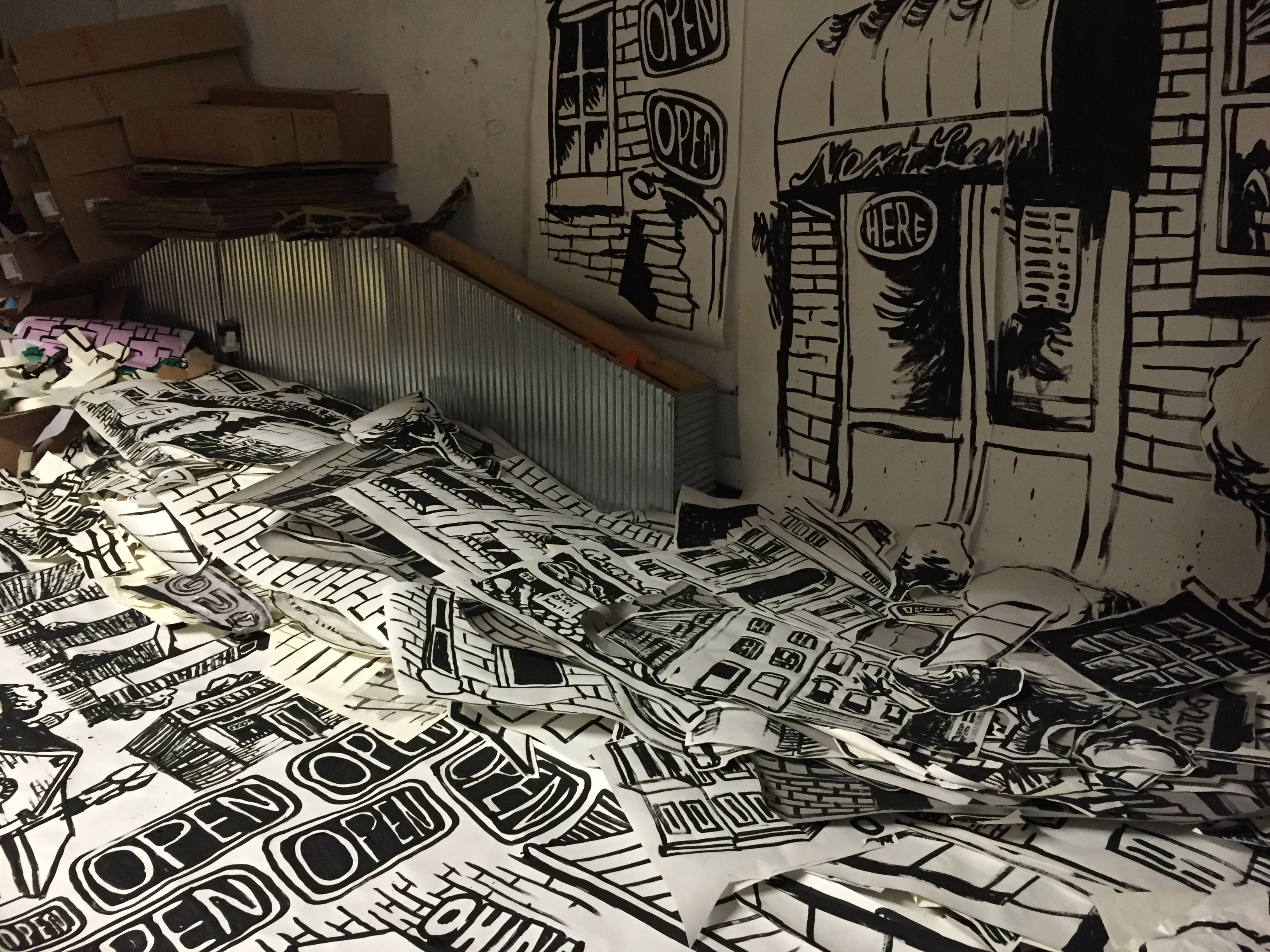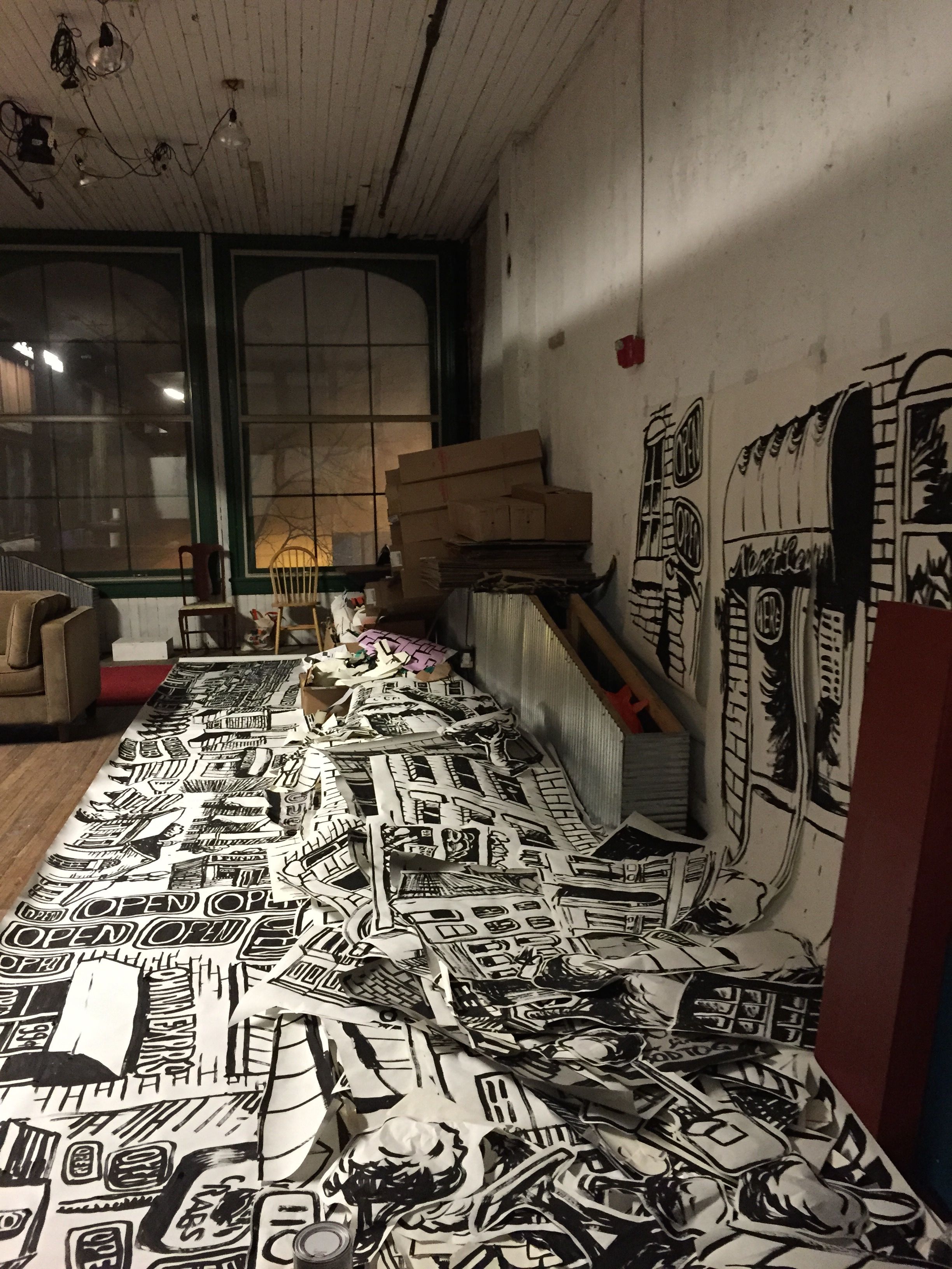 I ended last week with a dense pile of collage pieces in EMP’s rear space (where I’ve been stationed since the beginning). These pieces are destined for the entry, where they will be brought together in layers affixed to the walls and sculptural components, and maybe even suspended from the ceilings.