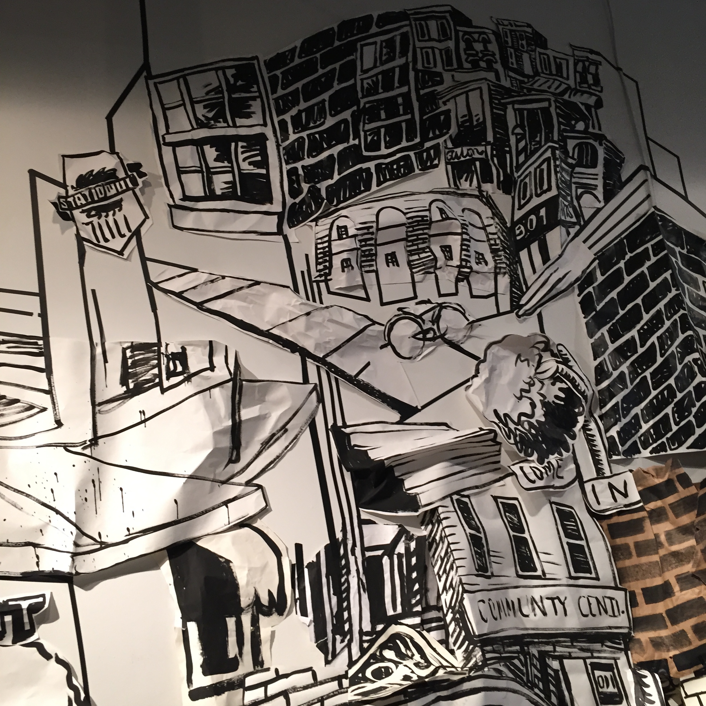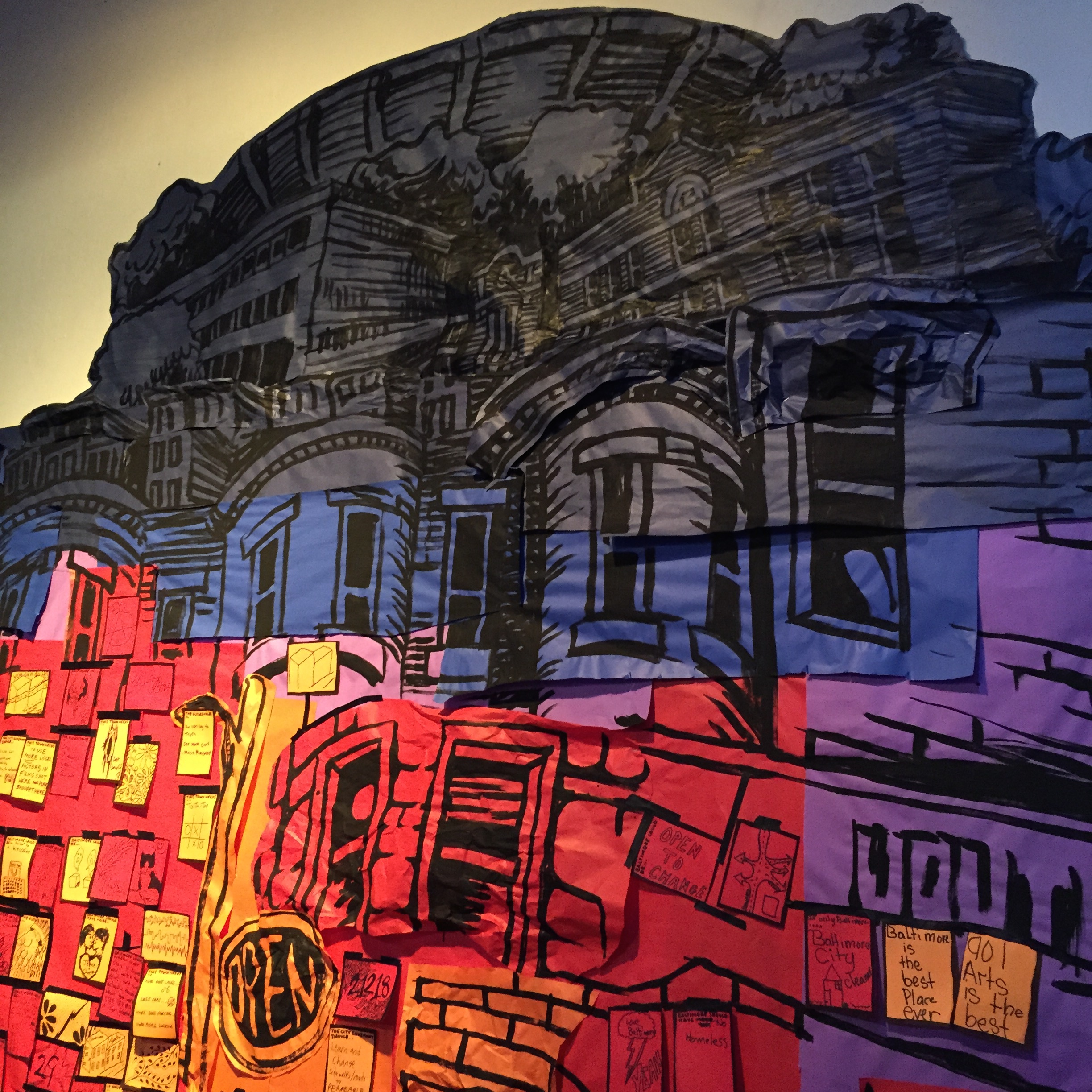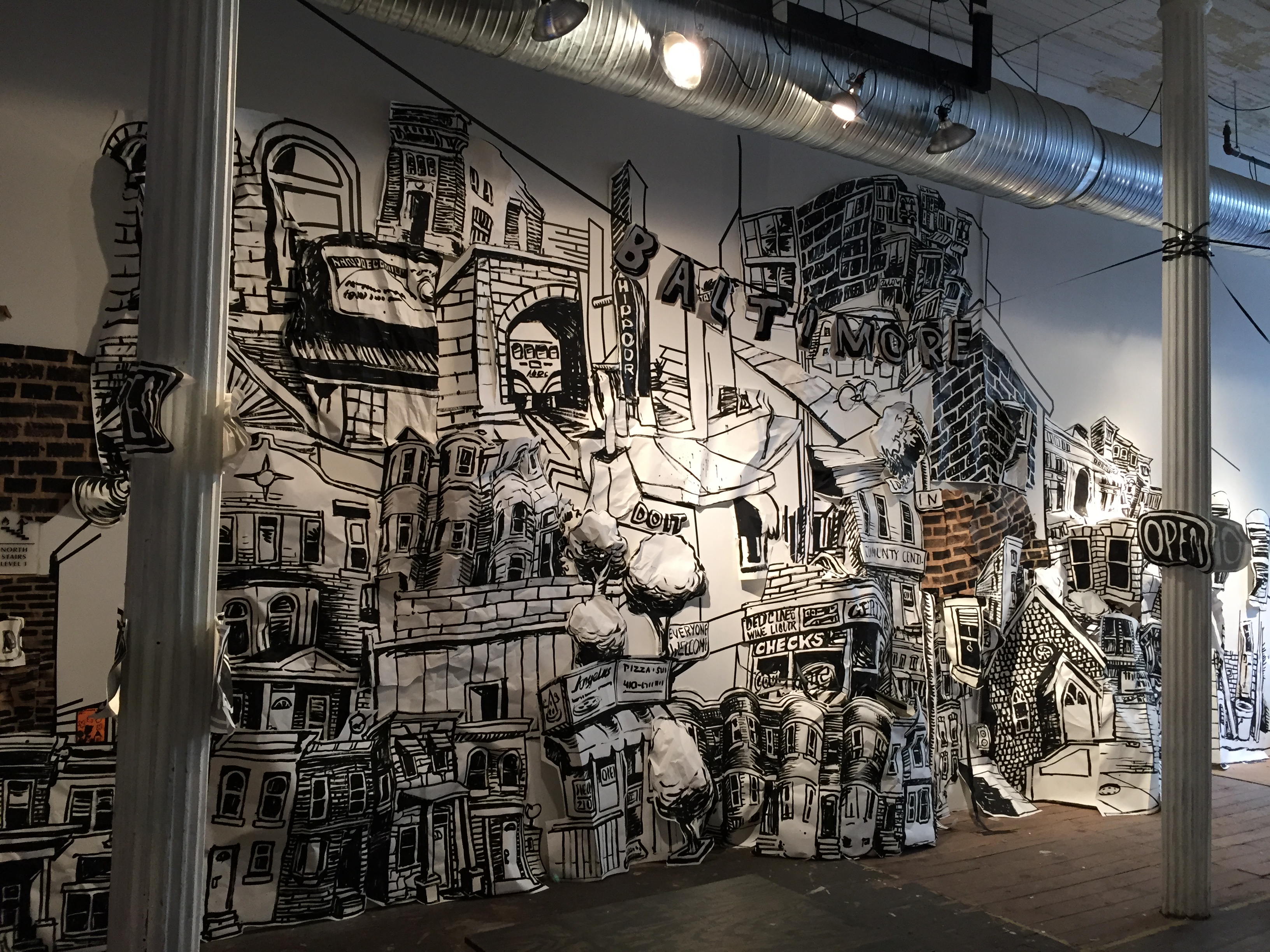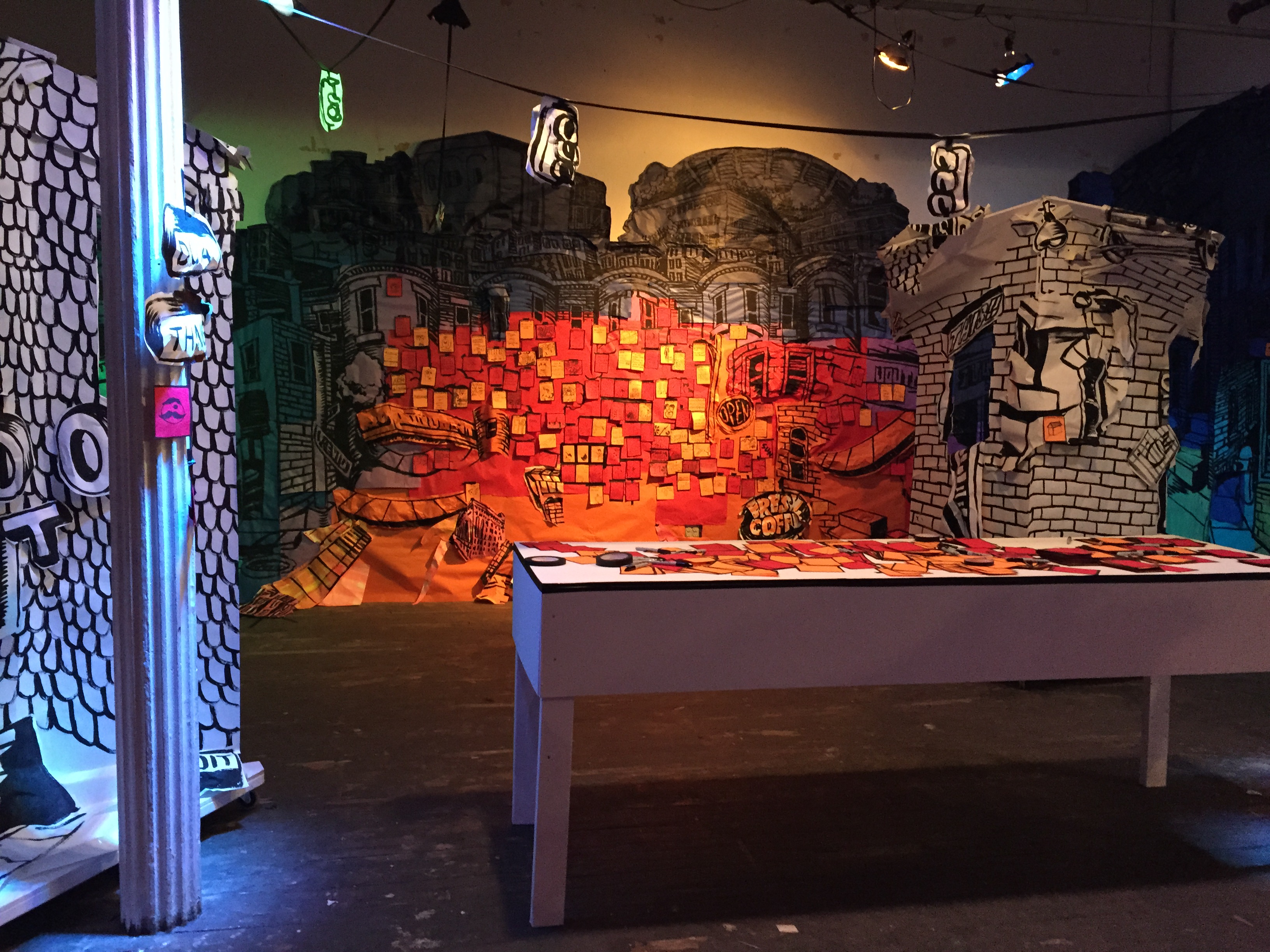 Right now, I’m working on some additional layers for the back as well as some floor pieces and further dangling signs. And people come in and add to the walls every day. Stop by and see how things are changing!