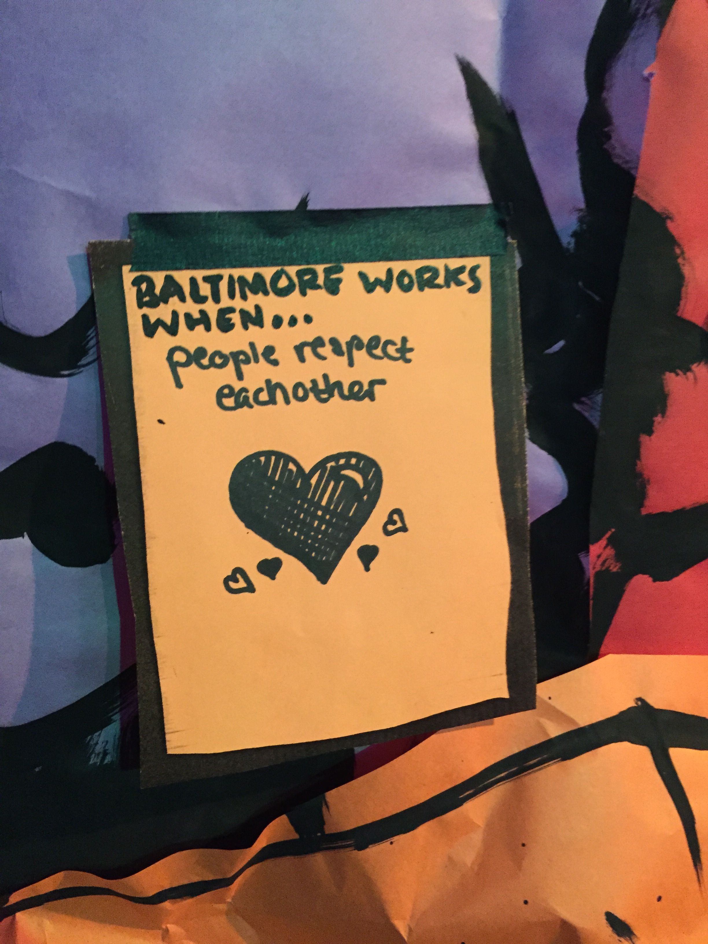 This has been an amazing experience – it’s been my absolute privilege to converse with hundreds of Baltimoreans coming in and out of EMP over the course of February, and to take in the vast range of words, marks, and images so many have been so generous to contribute. A few recent additions appear below, but I encourage you to come to EMP while you can and see for yourself the visual testament to the diversity of this city.
